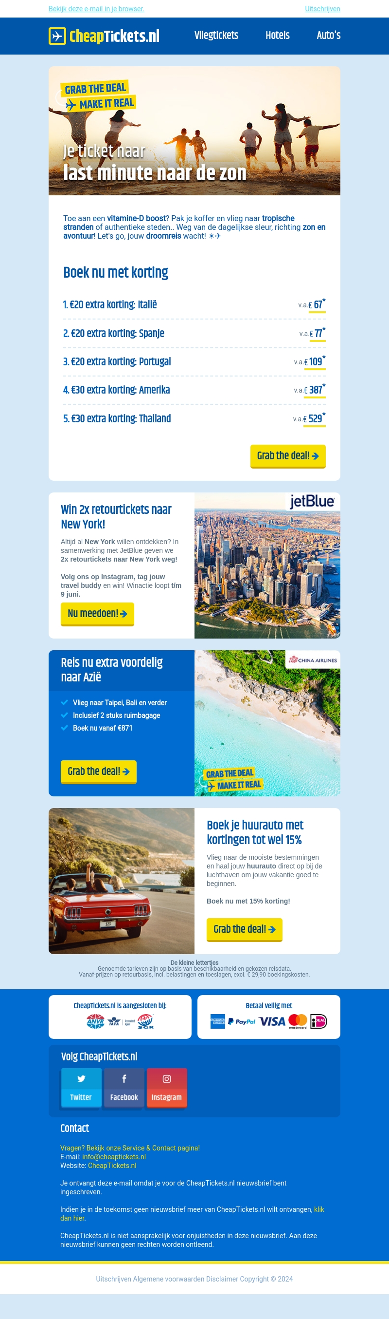 Ben je toe aan een vitamine-D boost? Vlieg last minute naar de zon met geweldige aanbiedingen van CheapTickets.nl. Geniet van kortingen tot €30 op bestemmingen zoals Italië, Spanje, en Amerika. Win ook 2 retourtickets naar New York met onze Instagram actie! Boek nu je spotgoedkope vlucht naar Azië of huur een auto met korting tot 15%. Mis deze kans niet!