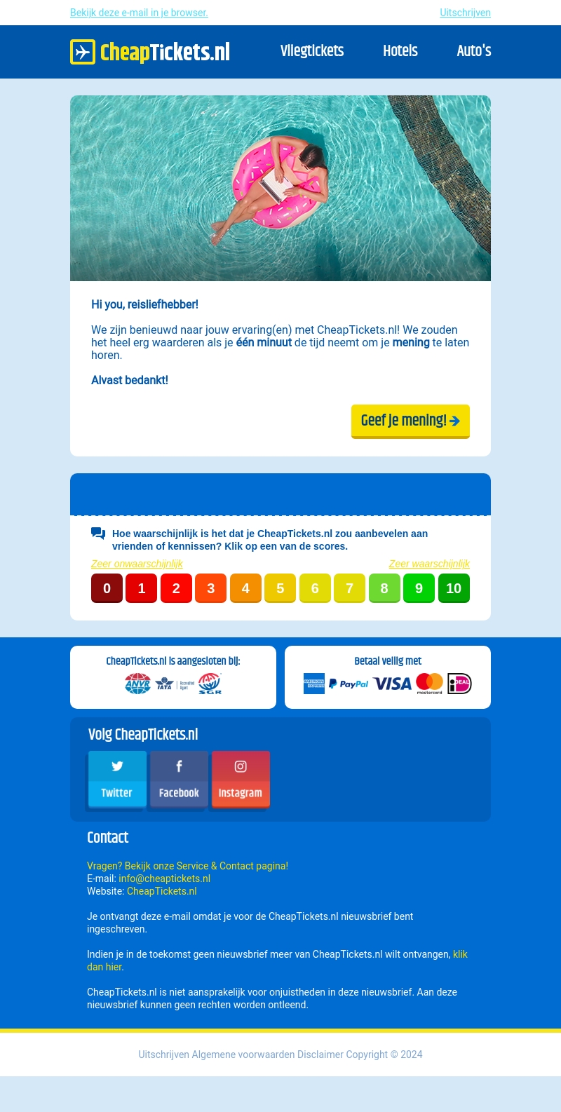 CheapTickets.nl wil graag jouw mening weten! Neem één minuut de tijd om jouw ervaringen met ons te delen. Jouw feedback helpt ons om onze service te verbeteren. Ontdek hoe je eenvoudig je mening kunt geven.