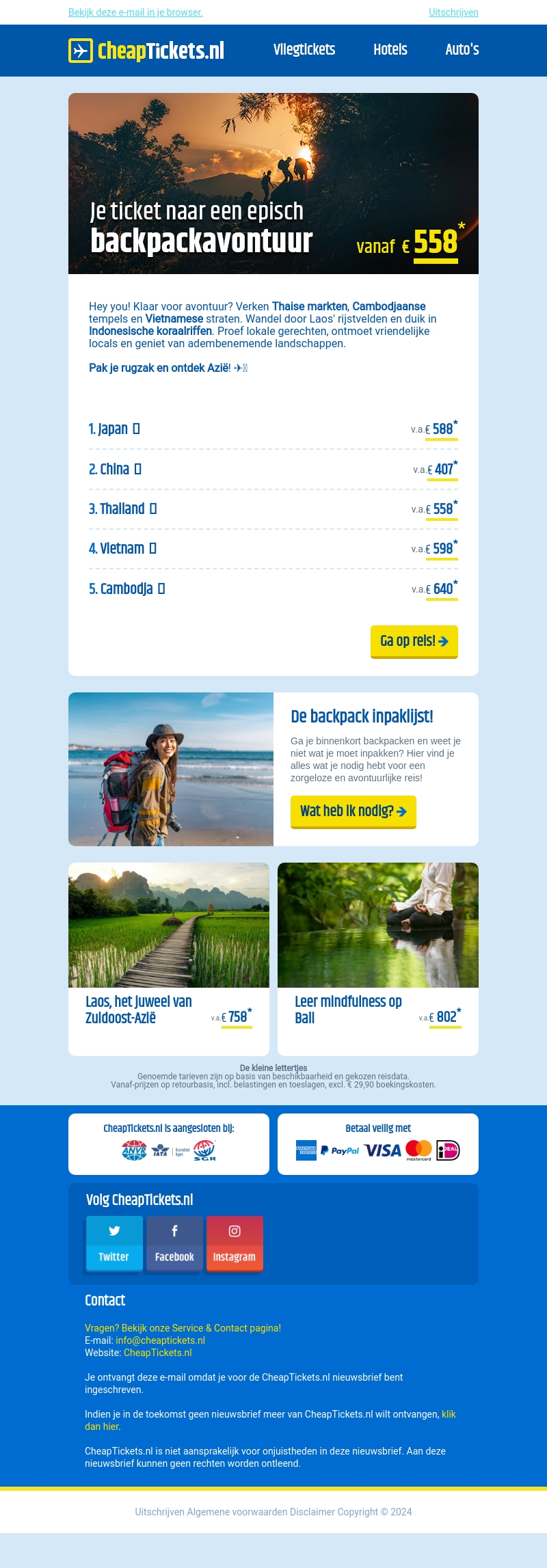Klaar voor avontuur? Verken Thaise markten, Cambodjaanse tempels en Vietnamese straten. Wandel door Laos' rijstvelden en duik in Indonesische koraalriffen. Boek je reis naar Azië vanaf slechts €558 met CheapTickets.nl.