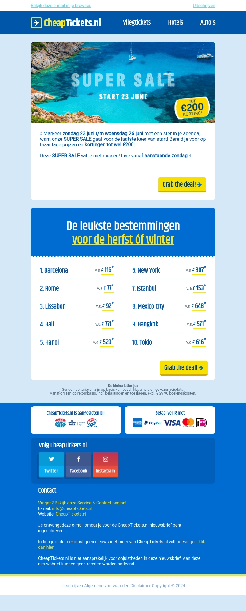 Markeer je agenda voor zondag 23 juni, want dan begint de SUPER SALE van CheapTickets.nl! Ontvang tot €200 korting op vluchten naar spannende bestemmingen. Wees voorbereid voor bizarre lage prijzen die je niet wilt missen. Grijp snel jouw kans voordat de SALE eindigt op woensdag 26 juni!
