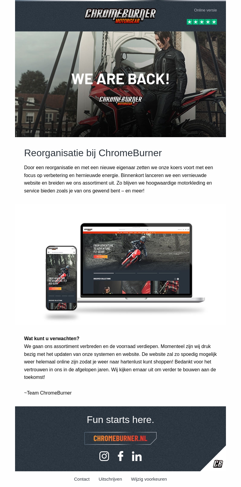 ChromeBurner is terug met vernieuwde energie en een uitgebreide collectie. Na een reorganisatie en met een nieuwe eigenaar openen we binnenkort onze vernieuwde website. Verwacht verbeterde motorkleding en een geweldige service zoals altijd.