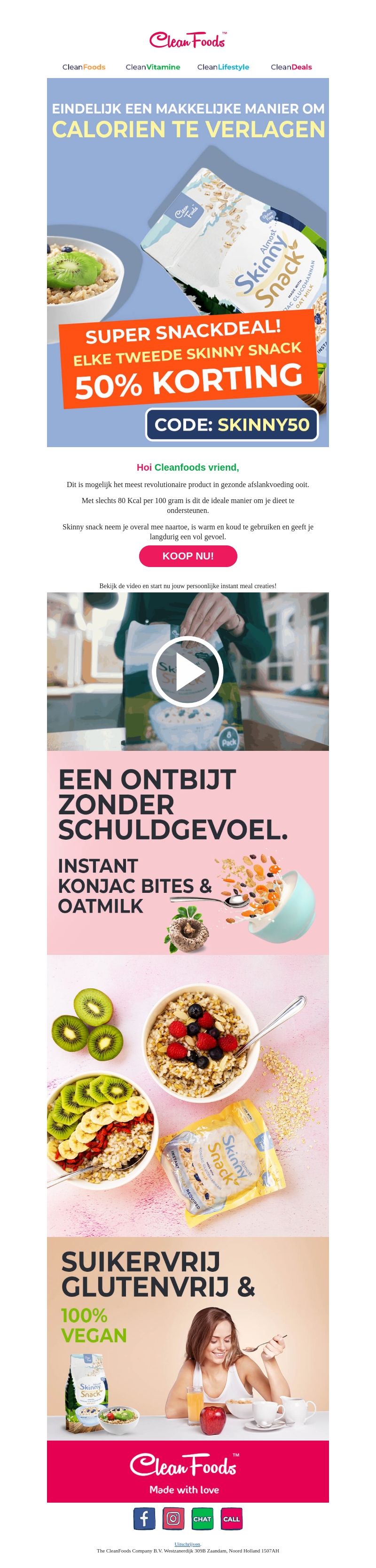 Verwen jezelf met de Skinny Snack van CleanFoods en ervaar smaak zonder schuldgevoel. Nu tijdelijk met 50% korting, biedt deze snack een caloriearme optie met slechts 80 Kcal per 100 gram. Perfect voor elk moment van de dag en eenvoudig mee te nemen. Profiteer vandaag nog van deze speciale aanbieding en begin je gezonde eetreis.