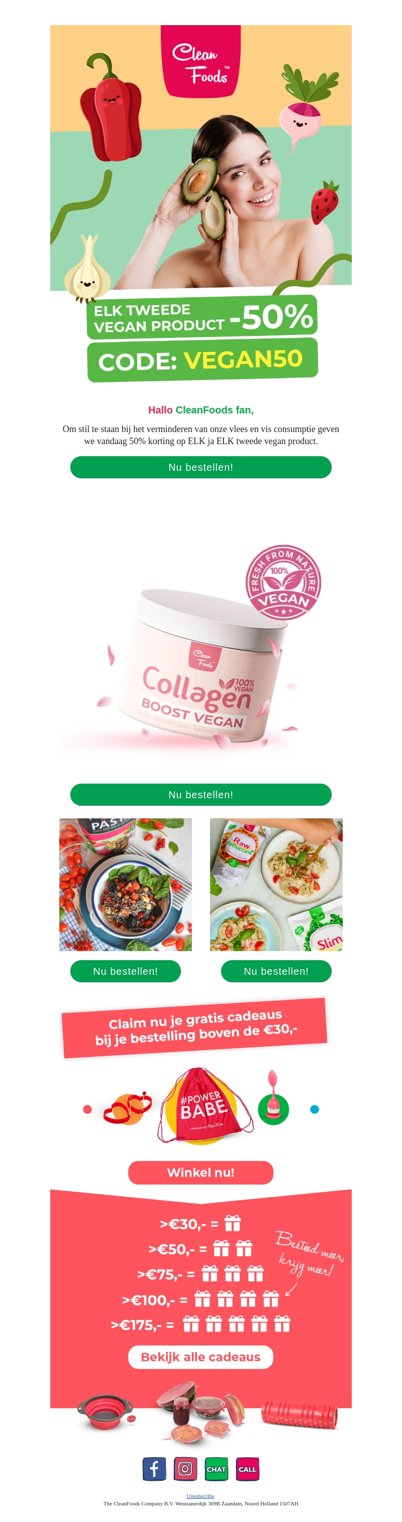 Hallo CleanFoods fan, Om stil te staan bij het verminderen van vlees en vis consumptie geven we vandaag 50% korting op elk tweede vegan product. Gebruik de code VEGAN50 bij het afrekenen. Bestel nu en geniet van onze heerlijke en gezonde vegan opties. Bovendien ontvang je gratis cadeaus bij bestellingen boven de €30.