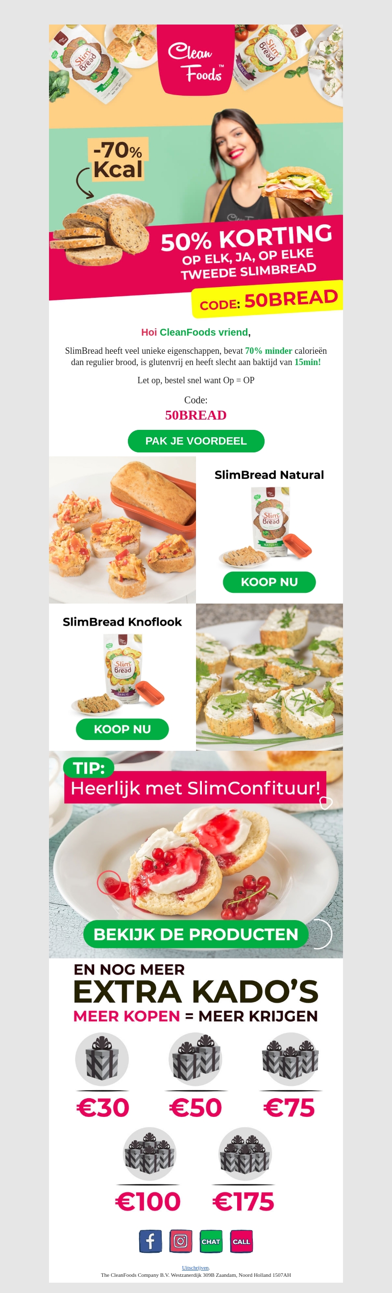 SlimBread van Clean Foods biedt nu een geweldige korting: 50% korting op elk tweede brood. Dit unieke brood bevat 70% minder calorieΓ«n, is glutenvrij en in slechts 15 minuten klaar. Mis deze deal niet en bestel snel met de code 50BREAD. Geniet ook van extra cadeaus bij grotere aankopen!