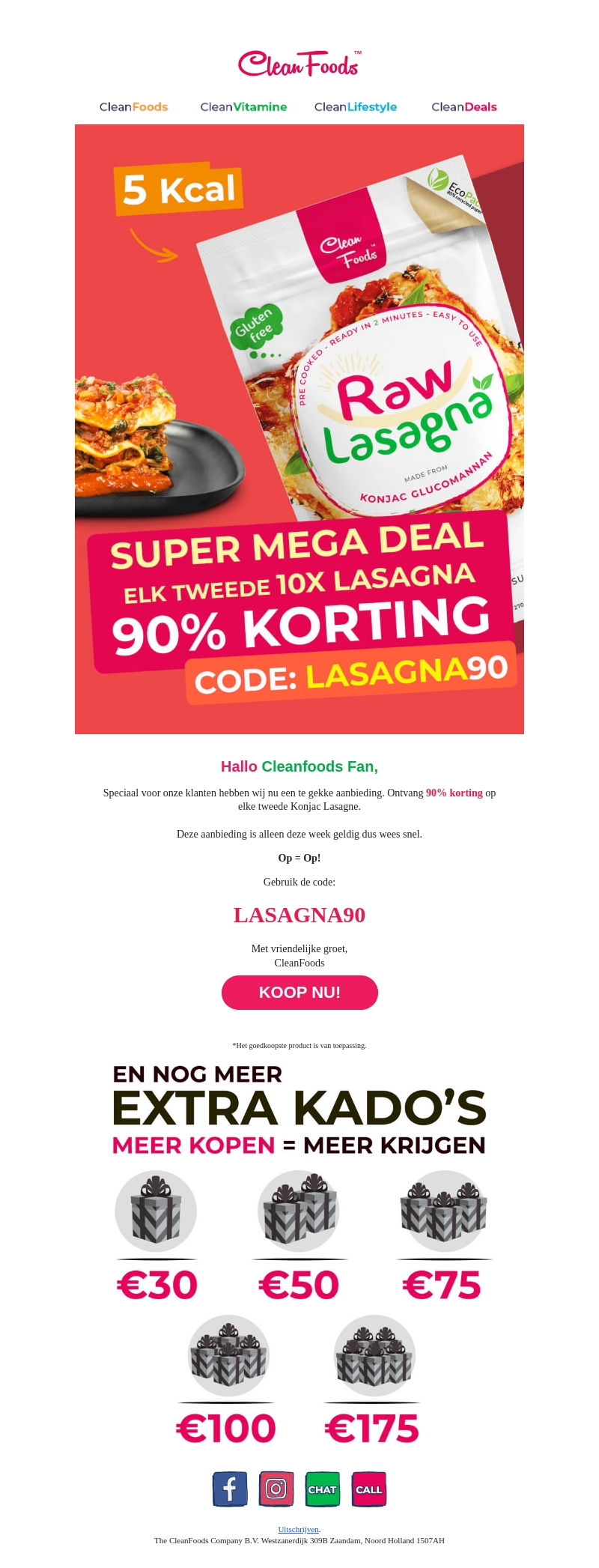 Mis deze ongelooflijke kans niet! Krijg 90% korting op elk tweede 10x pakket van CleanFoods' glutenvrije Konjac Lasagna. Deze aanbieding is alleen deze week geldig. Gebruik de code LASAGNA90 bij het afrekenen. Profiteer nu van deze mega deal voordat het te laat is!