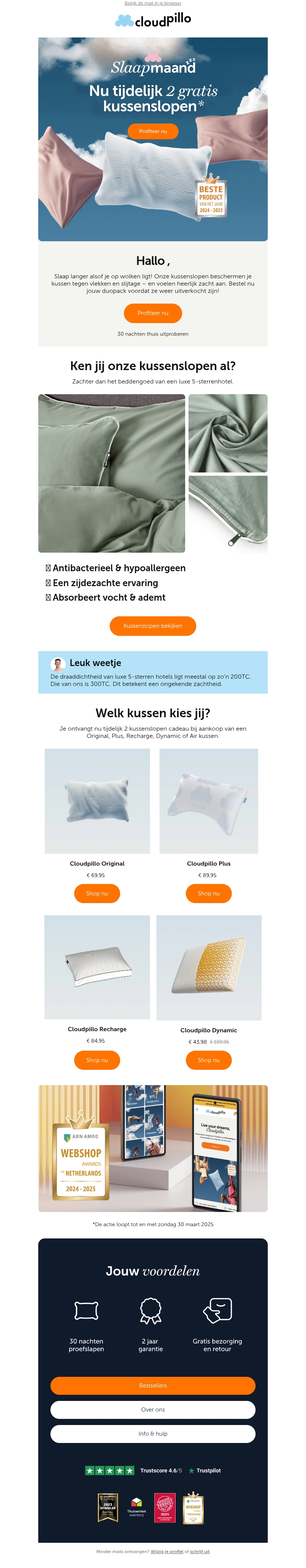 Slaap langer en comfortabeler met Cloudpillo. Deze maand ontvang je bij aankoop van een kussen tijdelijk twee gratis kussenslopen. De slopen zijn antibacterieel, hypoallergeen, en bieden een zijdezachte ervaring. Bestel vandaag nog en profiteer van deze unieke aanbieding. Kies jouw perfecte kussen en ervaar de luxe van een 5-sterrenhotel bij jou thuis.