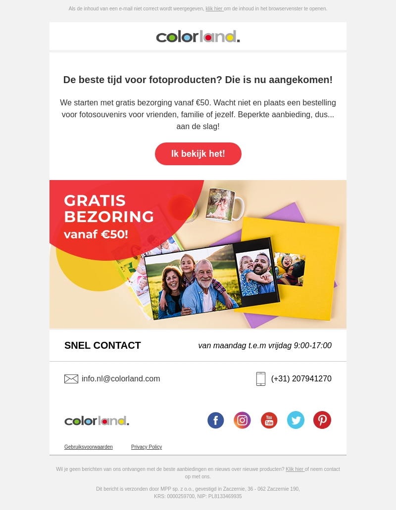 De beste tijd voor fotoproducten is aangebroken! Colorland biedt nu gratis bezorging vanaf €50. Plaats een bestelling voor fotosouvenirs voor vrienden, familie of jezelf. Dit is een beperkte aanbieding, dus wacht niet te lang!
