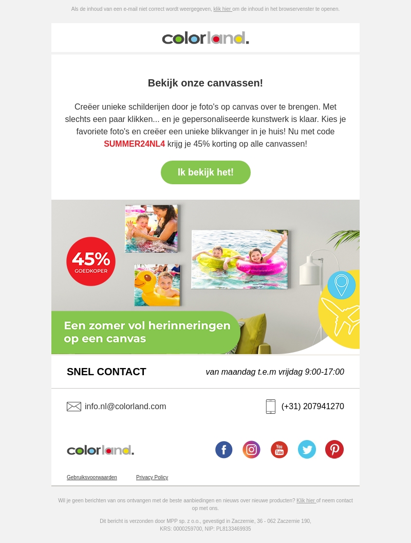 Creëer unieke schilderijen door je foto's op canvas over te brengen met Colorland. Met slechts een paar klikken maak je gepersonaliseerde kunstwerken voor je interieur. Gebruik nu de code SUMMER24NL4 en krijg 45% korting op alle canvassen. Begin vandaag nog met het vastleggen van je mooiste herinneringen!