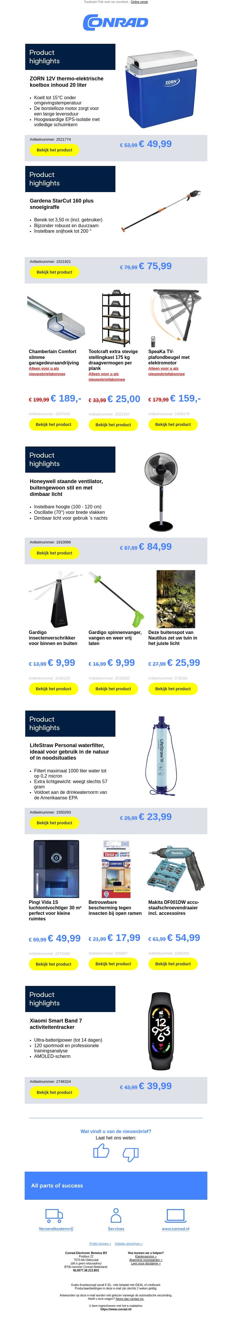 Grijp nu je kans op de beste aanbiedingen bij Conrad! Met kortingen op producten zoals de ZORN 12V thermo-elektrische koelbox, Gardena StarCut snoeigereedschap, en de Xiaomi Smart Band 7. Mis het niet en bekijk alle deals nu!