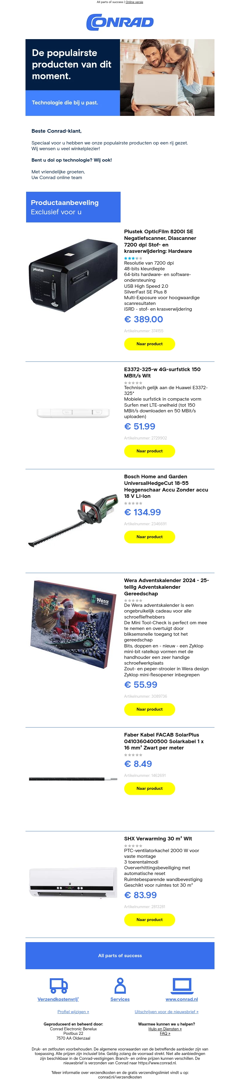 Blijf op de hoogte van de nieuwste en populairste producten bij Conrad, speciaal uitgekozen voor de tech-liefhebber. Of je nu zoekt naar een hoogwaardige scanner of een handige 4G-surfsticks, Conrad heeft het allemaal. Profiteer van speciale prijzen op uiteenlopende producten, van tuingereedschap tot verwarmingsapparatuur, en ontdek wat bij jou past.