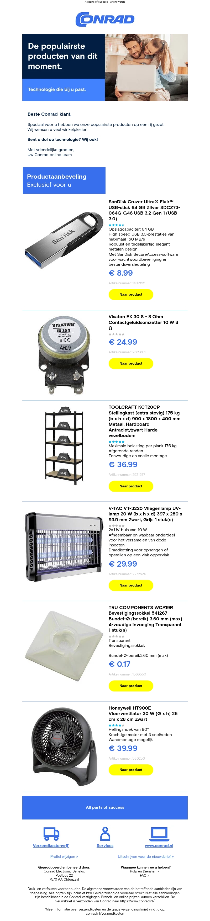 Beste Conrad-klant, speciaal voor u hebben we onze populairste producten op een rij gezet. Ben je dol op technologie? Wij ook! Bekijk nu onze aanbevelingen en geniet van geweldige aanbiedingen.