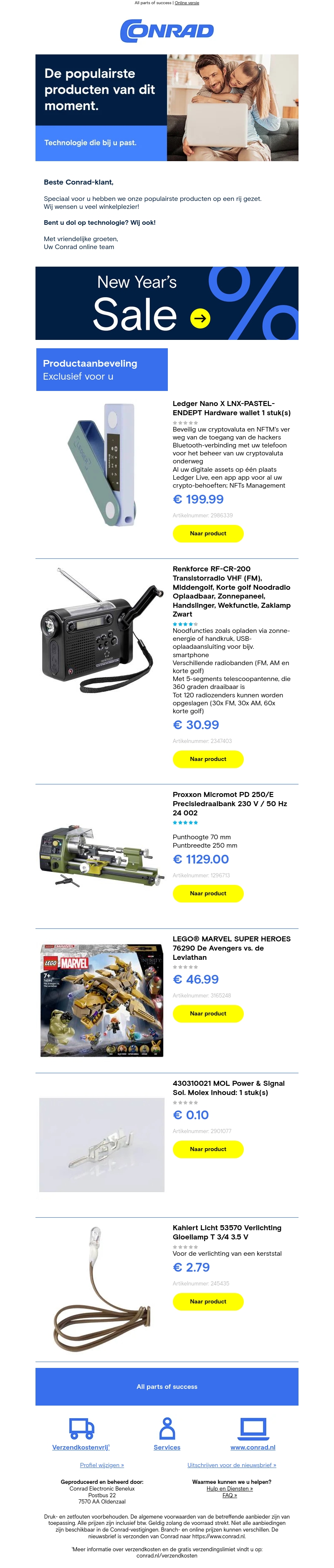 Deze nieuwsbrief van Conrad toont de populairste producten van dit moment. Ontdek de innovatieve uitdagingen van de nieuwste technologie. Profiteer nu van onze New Year's Sale met exclusieve kortingen. Blijf op de hoogte van geavanceerde gadgets en regelmatige updates. Mis deze geweldige deals niet!