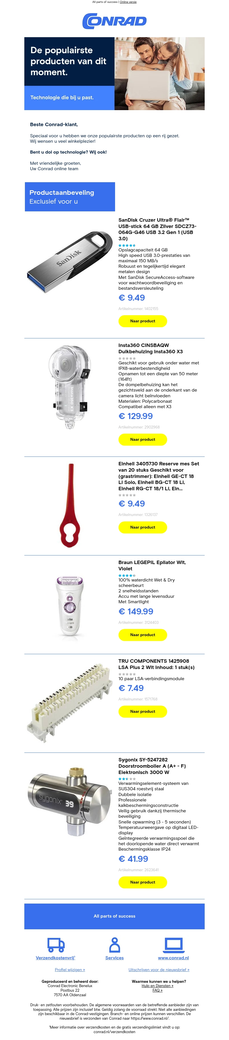 Welkom bij Conrad! In deze nieuwsbrief tonen we de meest populaire producten van het moment. Ontdek onze selectie van USB-sticks, duikbehuizingen, epilators en meer.