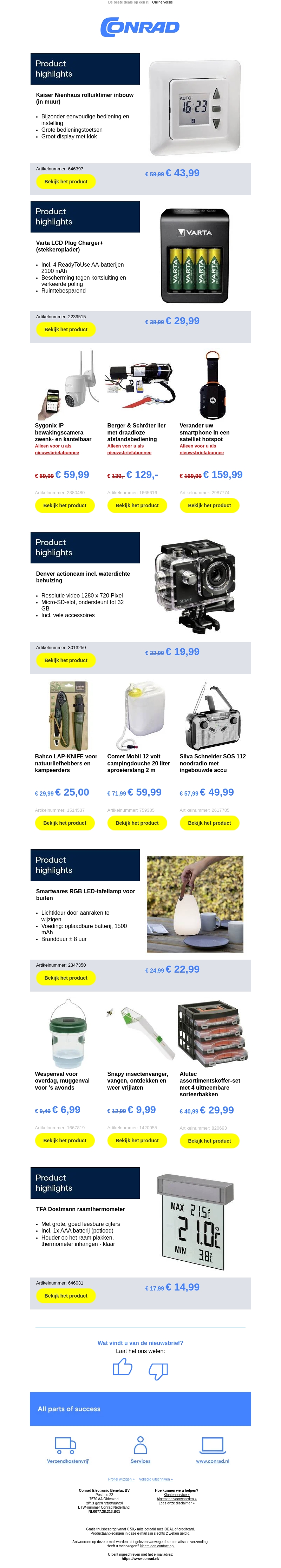 Conrad presenteert de nieuwste aanbiedingen van populaire producten. Van rolluiktimers en opladers tot smartwares-lampen en actiecams, er zijn volop deals te vinden. Bespaar nu en upgrade je gadgets en hulpmiddelen tegen scherpe prijzen.