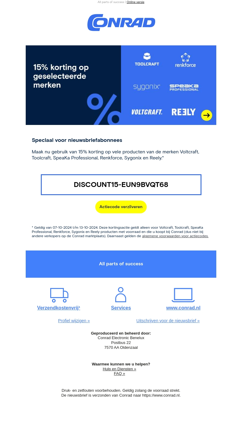 Speciaal voor nieuwsbriefabonnees biedt Conrad een exclusieve 15% korting aan op geselecteerde producten. Merken zoals Voltcraft, Toolcraft, en SpeaKa Professional zijn in de aanbieding. Zorg ervoor dat u deze kans niet mist en bespaar op uw volgende aankoop. De kortingsactie is geldig van 7 oktober tot 13 oktober 2024. Gebruik de unieke kortingscode en geniet van uw korting.