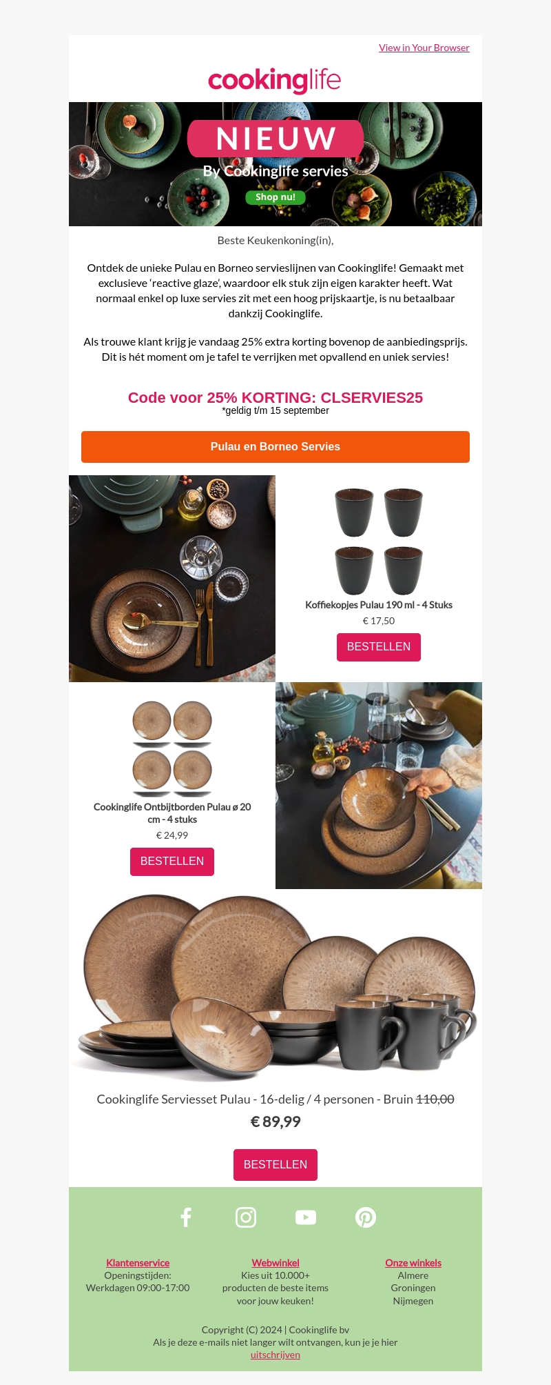 Beste Keukenkoning(in), ontdek de unieke Pulau en Borneo servieslijnen. Met 25% korting verrijk je je tafel met opvallend en uniek servies. De korting is geldig tot en met 15 september, dus wacht niet te lang!