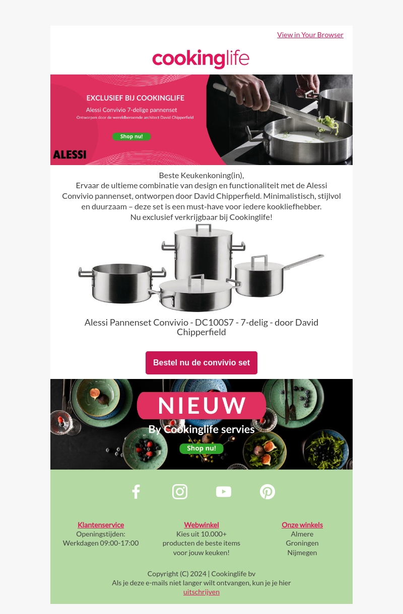 Ervaar design en functionaliteit met de Alessi Convivio pannenset, ontworpen door David Chipperfield. Minimalistisch, stijlvol en duurzaam - een must-have voor elke kookliefhebber. Nu exclusief verkrijgbaar bij Cookinglife.