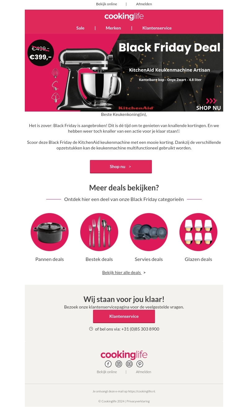 Black Friday is begonnen bij Cookinglife! Mis deze kans niet om geweldige kortingen te scoren op de KitchenAid Keukenmachine en andere keukendeals. Ontdek een wereld van aanbiedingen op pannen, bestek, servies, en glazen. Grijp je kans om je keukenuitrusting uit te breiden met kwaliteitsproducten tegen buitengewone prijzen.