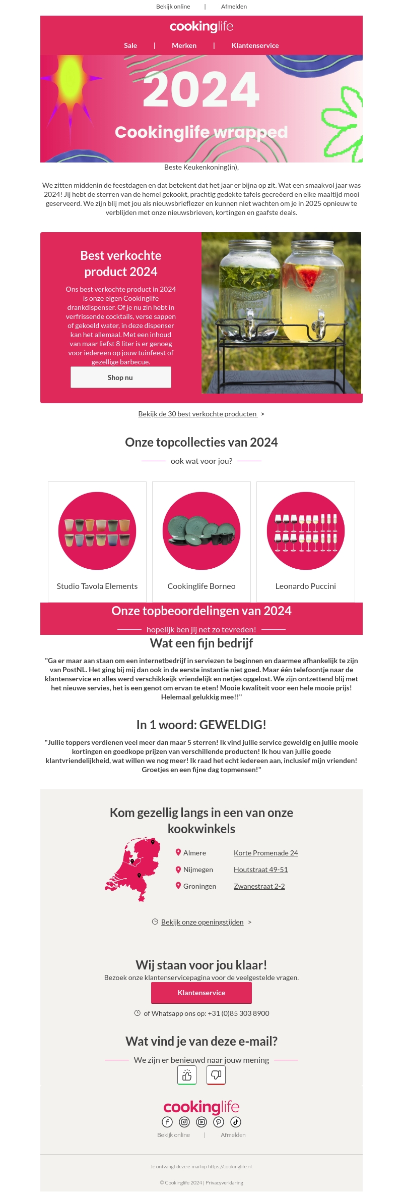We staan midden in de feestdagen en het jaar is bijna voorbij. Cookinglife presenteert de beste producten en topbeoordelingen van 2024. Ontdek gepersonaliseerde dranken dispensers, exclusieve serviezen en geniet van geweldige aanbiedingen. Bezoek onze winkels of online shop voor meer feestelijke inspiratie en kortingen.