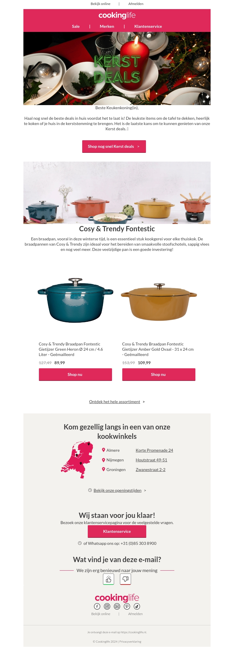 Haal de beste deals in huis voor Kerst bij Cookinglife! Van prachtig servies tot handige kookgerei, breng jouw keuken in de magie van de feestdagen. Bekijk onze Cosy & Trendy braadpannen en ontdek meer aanbiedingen in onze winkels. Wees er snel bij om te profiteren van onze speciale Kerst deals!