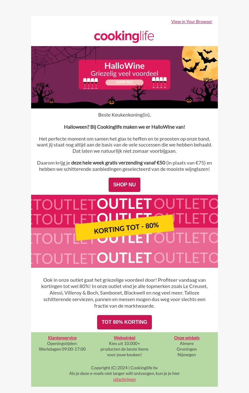 Halloween wordt HalloWine bij Cookinglife! Ontdek enorme kortingen op wijnaccessoires en geniet van gratis verzending bij bestellingen vanaf β¬50. Profiteer van kortingen tot wel 80% in de outlet, met topmerken als Le Creuset en Villeroy & Boch. Mis deze griezelige voordelen niet en hecht meer waarde aan jouw keukenervaring!