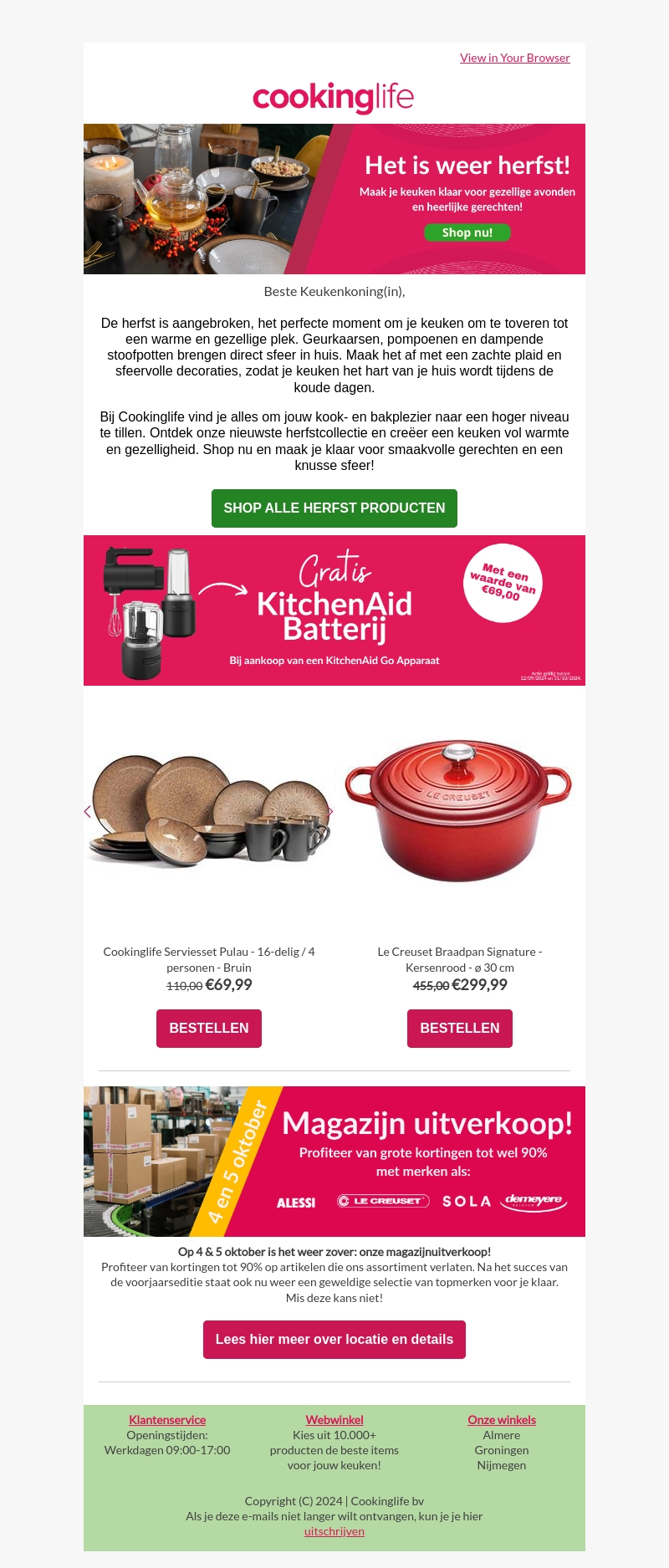 Het is weer herfst! Tijd om je keuken een warme en gezellige sfeer te geven. Shop nu de nieuwste herfstproducten bij Cookinglife en profiteer van de magazijnuitverkoop op 4 en 5 oktober. Mis de kans niet om te genieten van kortingen tot wel 90% op topmerken. Bekijk snel ons aanbod!