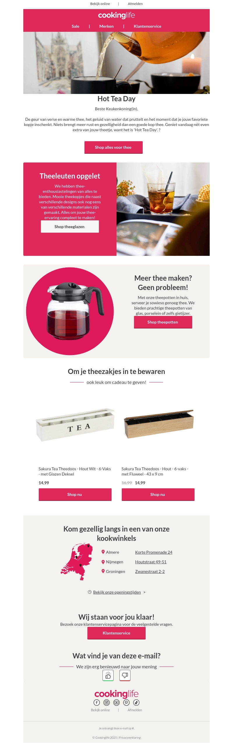 Het is thee tijd bij Cookinglife! Geniet van de nieuwste producten om je theemoment compleet te maken. Van stijlvolle theeglazen tot handige theepotten, we hebben alles om je te verwennen. Bekijk onze exclusieve aanbiedingen en maak van je theetijd een echt feestje. Plus, prachtige cadeau-ideeΓ«n voor de echte theeliefhebber.