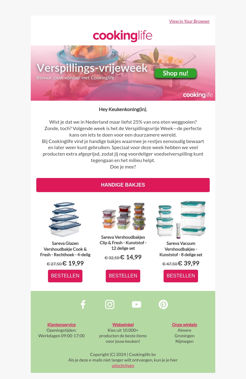 Volgende week is het de Verspillingsvrije Week bij Cookinglife. Wij bieden handige bakjes aan waarmee je restjes eenvoudig bewaart en later weer kunt gebruiken. Ontdek onze speciaal afgeprijsde producten en draag je steentje bij aan een duurzamere wereld. Doe je mee?
