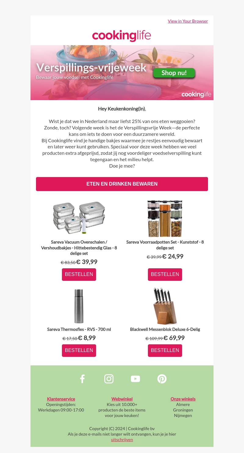 Wist je dat we in Nederland maar liefst 25% van ons eten weggooien? Tijdens de Verspillingsvrije Week kun je bij Cookinglife handige bakjes vinden waarmee je restjes eenvoudig bewaart. Doe mee en maak een duurzamere keuze!