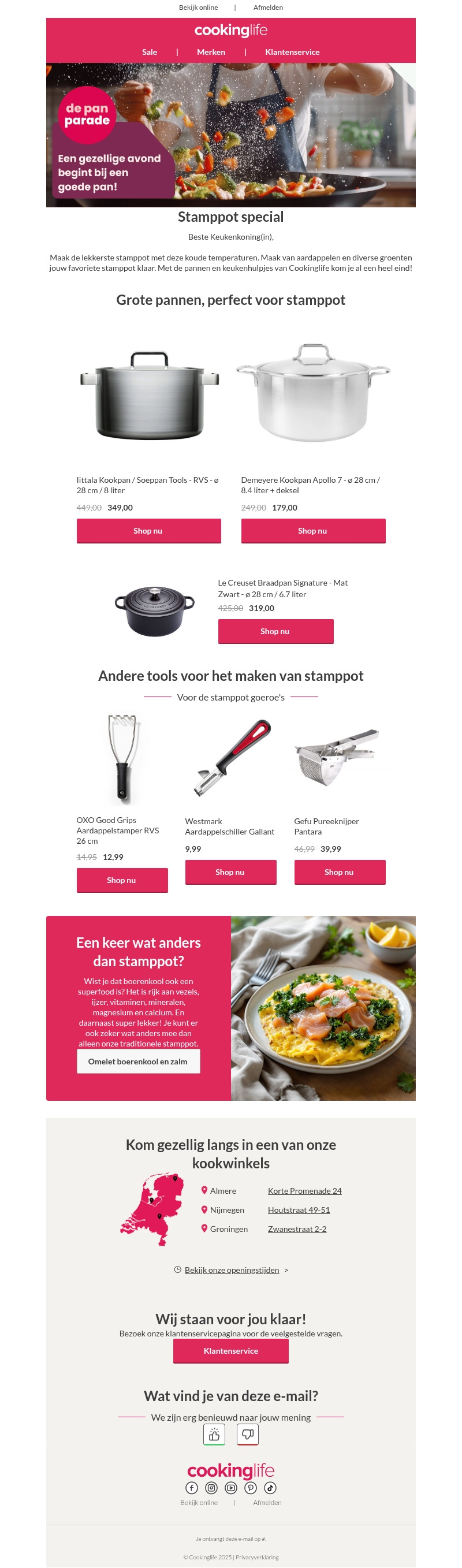 Bereid de lekkerste stamppot met onze topkwaliteit pannen en keukengerei. Ontdek ook smakelijke alternatieven zoals een omelet met boerenkool en zalm. Bezoek een van onze winkels in Almere, Nijmegen of Groningen voor meer inspiratie.