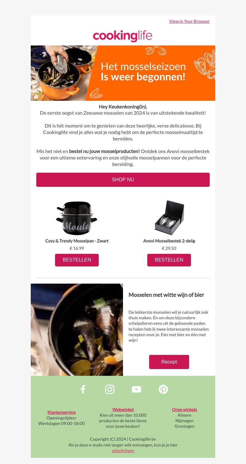 Het mosselseizoen van 2024 is van start gegaan met Zeeuwse mosselen van uitstekende kwaliteit. Bij Cookinglife vind je alles wat je nodig hebt voor de perfecte mosselmaaltijd. Bestel nu jouw mosselproducten en ontdek onze recepten voor mosselen met bier en wijn.