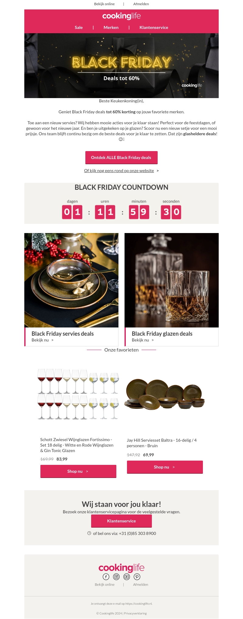 Ontdek geweldige kortingen tijdens de Black Friday bij Cookinglife. Geniet van tot 60% korting op diverse glazen en servies van topkwaliteit. Of u nu op zoek bent naar iets nieuws voor de feestdagen of gewoon uw collectie wilt uitbreiden, deze deals zijn te mooi om te missen.
