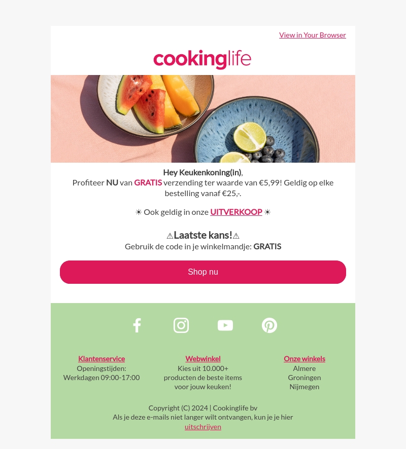 Hey Keukenkoning(in), dit is je laatste kans om te profiteren van gratis verzending ter waarde van €5,99 bij Cookinglife. Deze aanbieding geldt bij elke bestelling vanaf €25 en is ook geldig op producten in onze uitverkoop. Gebruik de code GRATIS in je winkelmandje. Shop nu!