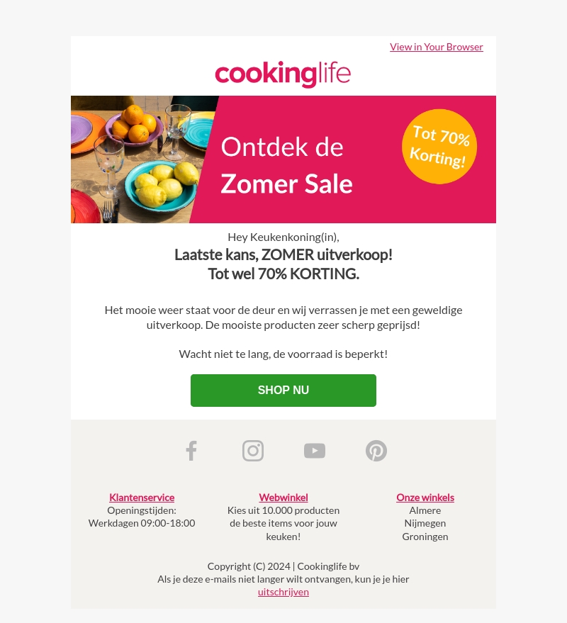 Hey Keukenkoning(in), dit is je laatste kans om te profiteren van onze ZOMER uitverkoop met kortingen tot wel 70%! Haast je, want de voorraad is beperkt. Shop nu bij Cookinglife en zorg ervoor dat je niets mist.