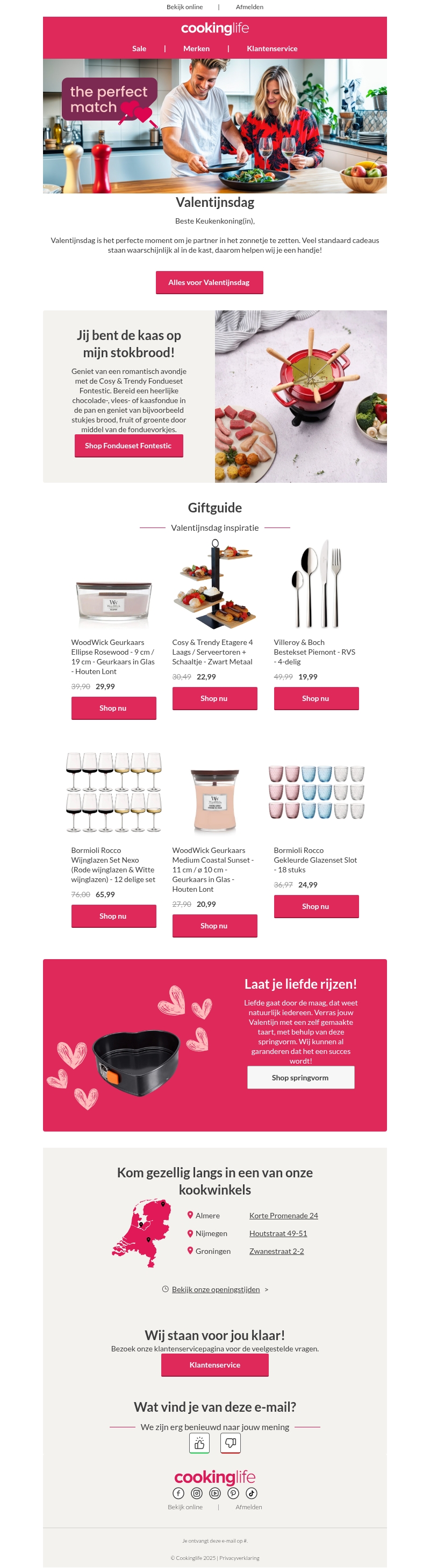 Valentijnsdag is de perfecte gelegenheid om je partner in het zonnetje te zetten met unieke cadeaus. Ontdek onze giftguide vol inspiratie, van geurkaarsen tot bestek. Laat je liefde rijzen met speciale bakvormen of geniet samen van een romantisch fondueavondje. Bezoek onze kookwinkels voor nog meer geweldige cadeau-ideeΓ«n!