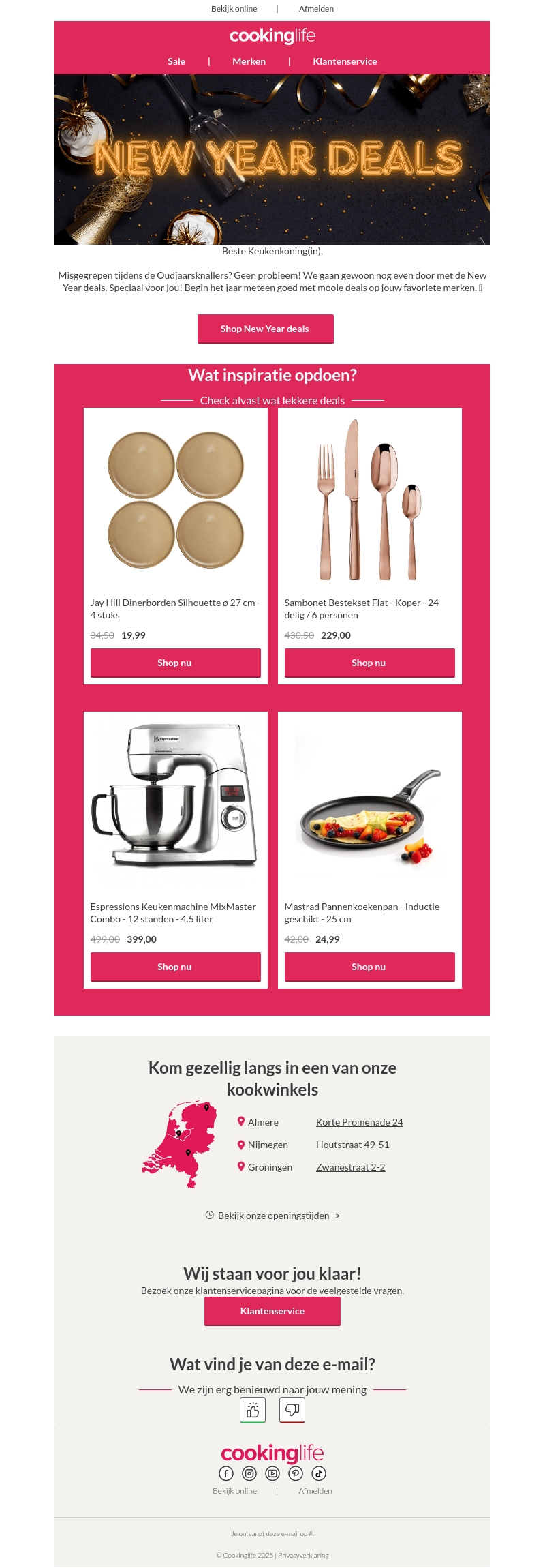 Mis de Oudjaarsknallers niet bij Cookinglife! We verlengen onze New Year deals met fantastische kortingen op topmerken. Van stijlvolle dinerborden tot een krachtige keukenmachine, er is voor ieder wat wils. Bezoek onze winkels of shop online en profiteer van de beste aanbiedingen. Begin het nieuwe jaar goed met Cookinglife!