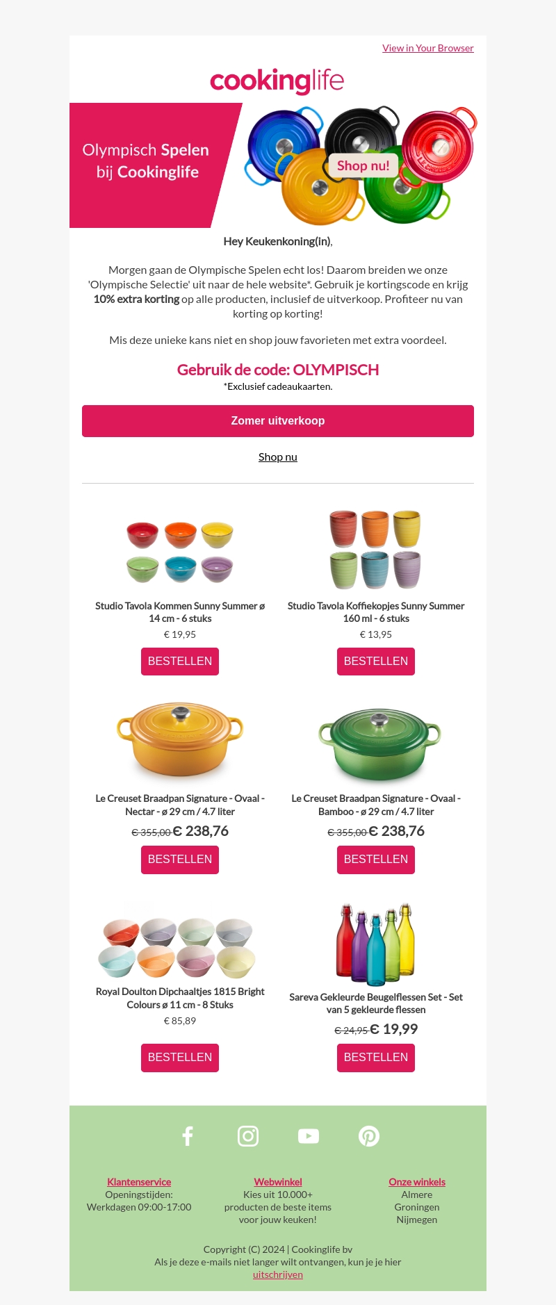 Mis deze exclusieve kans niet! Cookinglife biedt nu dubbele Olympische korting op het gehele assortiment. Gebruik de code 'OLYMPLISCH' en profiteer van 10% extra korting op alle producten, inclusief de uitverkoop. Deze aanbieding geldt slechts voor een beperkte tijd, dus shop je favorieten vandaag nog!