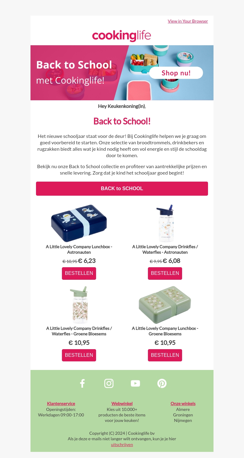 Het nieuwe schooljaar staat voor de deur en bij Cookinglife helpen we je graag om goed voorbereid te beginnen. Onze collectie lunchboxen, drinkflessen en rugzakken biedt alles wat je kind nodig heeft. Profiteer nu van aantrekkelijke prijzen en snelle levering!