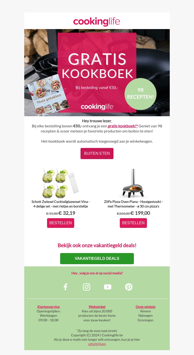Bij elke bestelling boven β¬50,- ontvang je een gratis kookboek met 98 heerlijke recepten. Scoor je favoriete producten om buiten te eten en ontdek geweldige deals. Het kookboek wordt automatisch toegevoegd aan je winkelwagen. Mis deze kans niet!