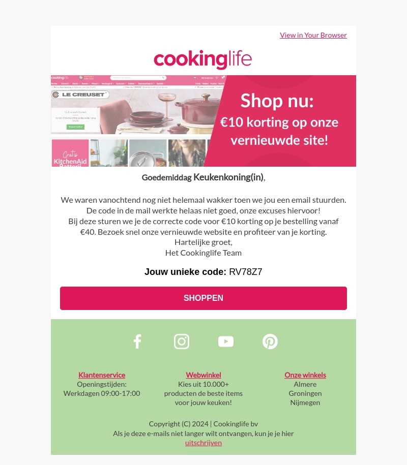 Cookinglife biedt zijn excuses aan voor de eerdere e-mailfout en geeft een €10 kortingscode weg voor bestellingen vanaf €40. Bezoek onze vernieuwde website en gebruik de code om van de korting te profiteren. Mis deze kans niet!