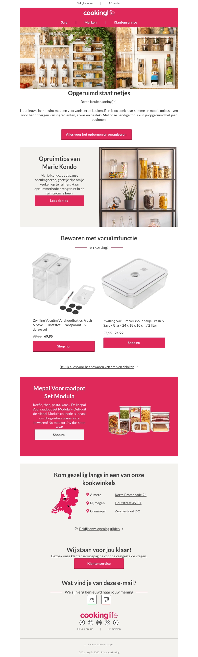 Begin het nieuwe jaar met een geordende keuken. Ontdek slimme opbergoplossingen voor ingrediënten en servies. Laat je inspireren door de opruimtips van Marie Kondo en profiteer van kortingen op vacuümbewaarsets en de Mepal Voorraadpot Set Modula. Bezoek onze winkels voor persoonlijk advies.