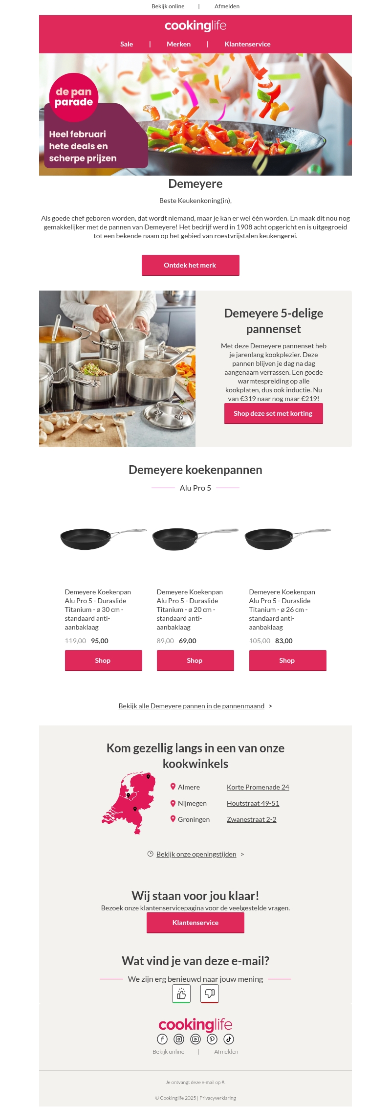Verwelkom de maand februari met hete deals en scherpe prijzen op Demeyere pannen. Maak koken makkelijker met de hoogwaardige roestvrijstalen pannen van Demeyere. Profiteer nu van kortingen, zoals op de Demeyere 5-delige pannenset en meer. Bekijk onze winkels voor persoonlijk advies en ontdek alle aanbiedingen. Mis het niet en word een echte keukenheld!