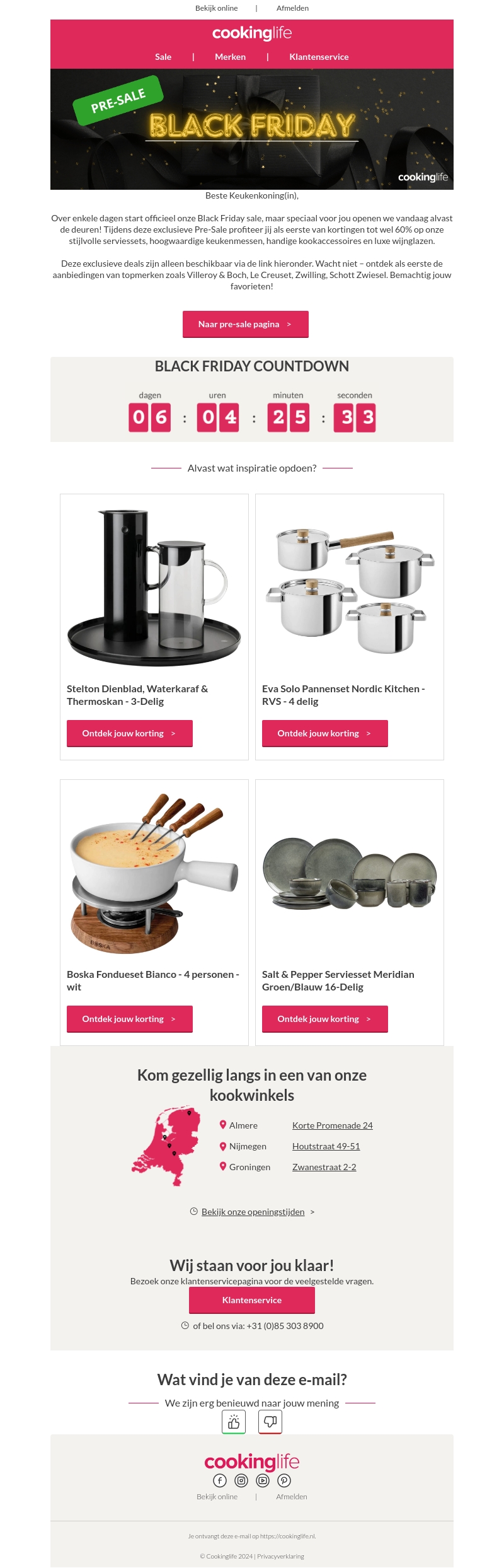 De Black Friday pre-sale van Cookinglife is begonnen! Profiteer van kortingen tot 60% op exclusieve artikelen zoals serviessets en keukenaccessoires. Mis deze kans niet om als eerste de beste deals van topmerken te bemachtigen. Alleen beschikbaar via onze speciale pre-sale link. Haast je en shop jouw favorieten vóórdat de officiële sale begint.