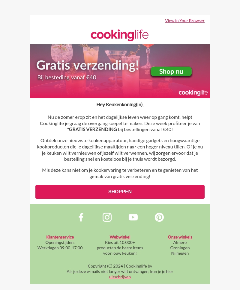 Nu de zomer erop zit, biedt Cookinglife gratis verzending bij bestellingen vanaf β¬40. Ontdek de nieuwste keukenapparatuur en gadgets om je dagelijkse maaltijden te verbeteren. Mis de kans niet om je kookervaring te verbeteren met deze geweldige aanbieding!