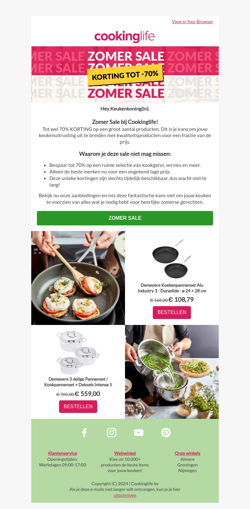 Hey Keukenkoning(in), ontdek onze Zomer Sale bij Cookinglife. Geniet van kortingen tot wel 70% op een breed scala aan producten, van kookgerei tot servies. Mis deze kans niet om je keukenuitrusting uit te breiden met hoogwaardige producten voor een lage prijs.