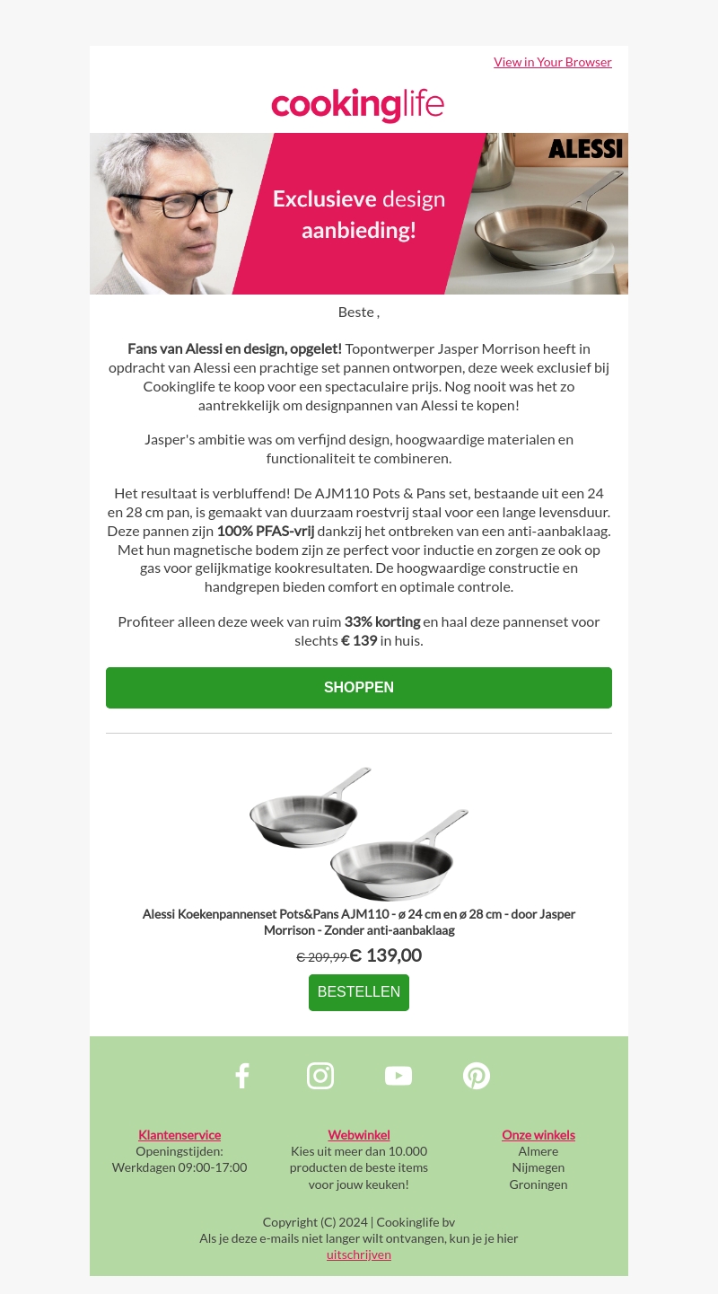 Fans van Alessi en design, opgelet! Deze week heeft Cookinglife een exclusief aanbod: de Alessi Koekenpannenset voor slechts €139. Ontworpen door topontwerper Jasper Morrison, zijn deze pannen gemaakt van duurzaam roestvrij staal en 100% PFAS-vrij. Profiteer nu van 33% korting!