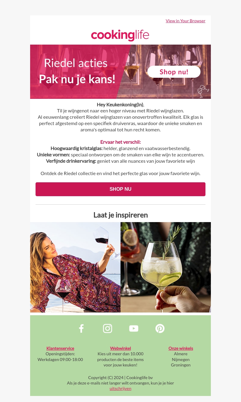Hey Keukenkoning(in), til je wijnmoment naar een hoger niveau met Riedel wijnglazen. Riedel biedt glazen van ongeΓ«venaarde kwaliteit, perfect afgestemd op verschillende druivenrassen. Ontdek de unieke vormen en verfijnde drinkervaring met kortingen tot wel 60%. Shop nu bij Cookinglife en vind jouw perfecte glas.