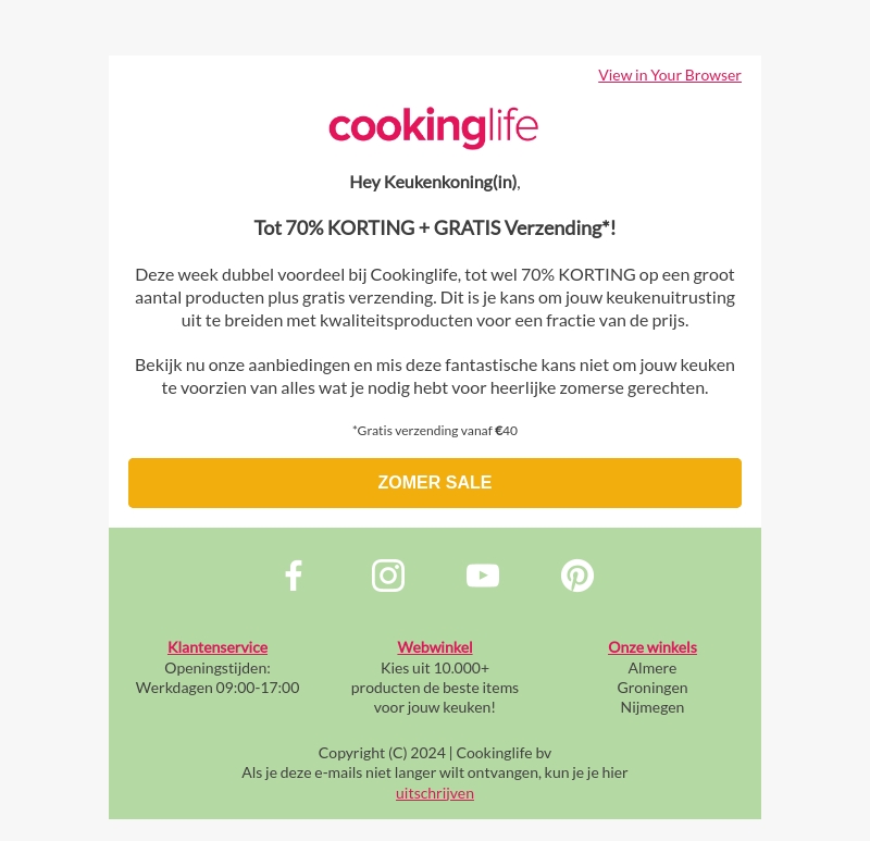 Deze week biedt Cookinglife dubbele voordelen aan: tot wel 70% korting op een groot aantal producten en gratis verzending. Dit is jouw kans om je keukenuitrusting uit te breiden met kwaliteitsproducten voor een fractie van de prijs. Mis deze fantastische kans niet en voorzie je keuken van alles wat je nodig hebt voor heerlijke zomerse gerechten.