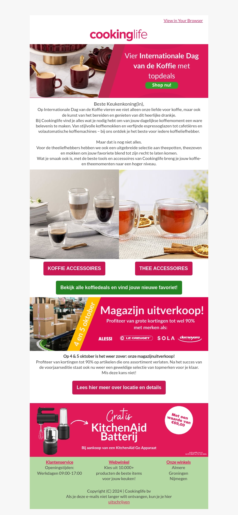 Vier de Internationale Dag van de Koffie met de beste deals op koffieaccessoires bij Cookinglife. Ontdek stijlvolle koffiemokken, espresso glazen, volleautomaten en meer. Ook thee liefhebbers komen aan hun trekken met diverse theepotten en theeglazen. En profiteer van grote kortingen tijdens onze magazijnuitverkoop op 4 en 5 oktober.