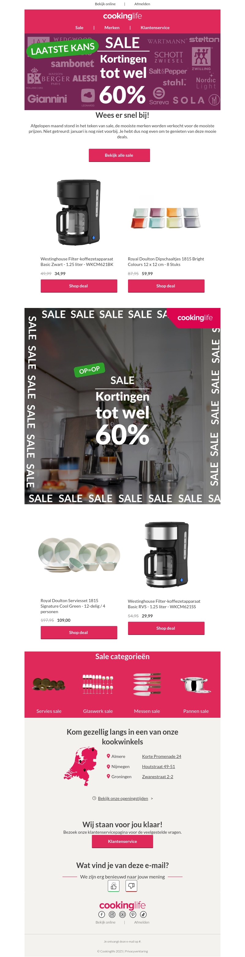 Profiteer nu van kortingen tot wel 60% op diverse producten bij Cookinglife. Van servies tot glaswerk en meer, deze sale is een kans die je niet wilt missen. Bezoek onze website en bekijk alle aanbiedingen voordat ze op zijn. Wacht niet langer en geniet van deze fantastische deals om je keukenuitrusting compleet te maken.